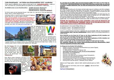im Juni 2023 bietet unser SPD Ortsverein wieder eine Kulturfahrt in die Steiermark an. Aufgrund der vielen Voranfragen ist diese Fahrt jedoch schon zwischenzeitlich ausgebucht. Auf der einen Seite freut es uns natürlich, andererseits .... bleibt für weitere Interessenten derzeit leider nur die Ersatzbank. Schließlich mussten wir die Fahrt schon zweimal verschieben.