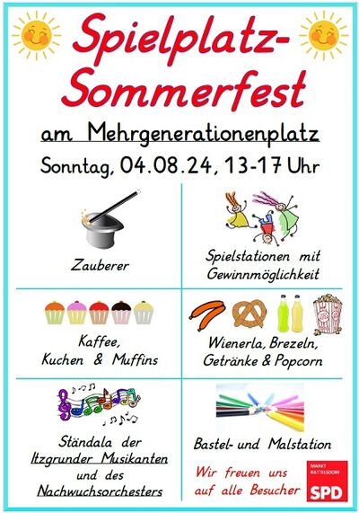 Im Rahmen des Sommer-Ferienprogramms veranstaltet der SPD-Ortsverein Rattelsdorf in diesem Jahr sein bewährtes Sommerfest an neuer Stätte - dem Mehrgenerationenplatz. An den zusätzlichen Spielstationen besteht neben Spaß am Spiel für alle Teilnehmer die Möglichkeit, etwas zu gewinnen. Außerdem gibt es eine Zaubershow, Mal- und Bastelmöglichkeiten sowie ein Ständala der Itzgrunder Musikanten und des Nachwuchsorchesters.