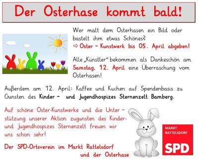 Der Osterhase hat sich bei uns gemeldet und lässt ausrichten, dass er sehr gerne an die Oster-Aktionen des SPD-Ortsvereins aus den letzten Jahren zurückdenkt, als ihn aus der ganzen Marktgemeinde Rattelsdorf viele schöne Kunstwerke erreichten.