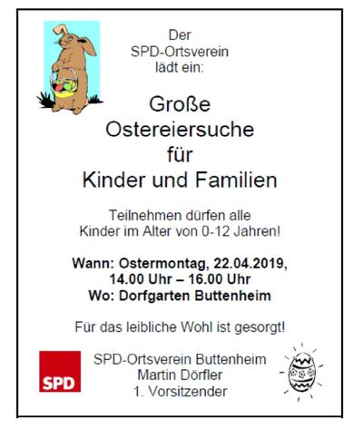 Der SPD-Ortsverein Buttenheim hat sich für dieses Jahr eine besondere Überraschung für alle Kinder und Familien einfallen lassen und lädt hiermit alle Kinder im Alter von 0-12 Jahren zusammen mit ihren Familien am Ostermontag, dem 22.04.2019, in der Zeit zwischen 14.00 Uhr und 16.00 Uhr zur großen Ostereiersuche für Kinder und Familien ein.