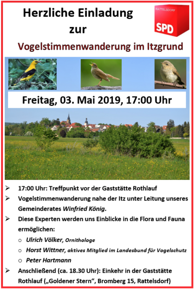 Unter Leitung unseres Rattelsdorfer Gemeinderats Winfried König und fachkundiger Experten lauschen wir den Stimmen heimischer Vögel und erhalten Einblick in den Flora und Fauna des Itzgrunds. Die Wanderung startet für alle Interessierten am 3. Mai um 17 Uhr vor der Gaststätte Rothlauf (Bromberg 15) in Rattelsdorf.