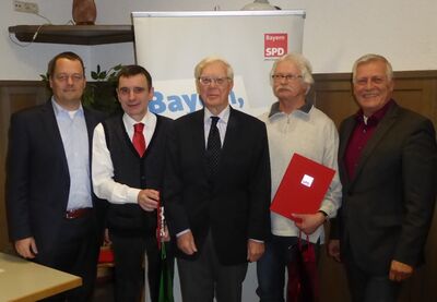 Ein Höhepunkt der jüngsten Mitgliederversammlung des SPD-Ortsvereins Memmelsdorf war die Ehrung langjähriger aktiver Mitglieder durch den früheren Parlamentarischen Staatssekretär und MdB Dr. Hans de With. Geehrt wurden Rudi Raithel, Memmelsdorf für 45 Jahre, Johannes Walter und Rainer Kroack, Merkendorf, für 35 Jahre Mitgliedschaft.